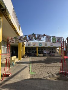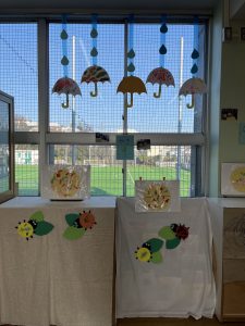 年長組は、大きな画用紙にはみ出るぐらいの絵を展示し、牛乳パックを使った紙漉きや、等身大の自分にお泊まり会に着用したTシャツを着せて展示。