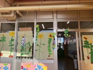 年少組は、おしゃれな帽子や、エプロンに好きな飾りをつけたり、大きな紙に描いた物を飾りました。